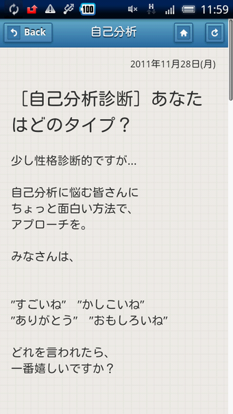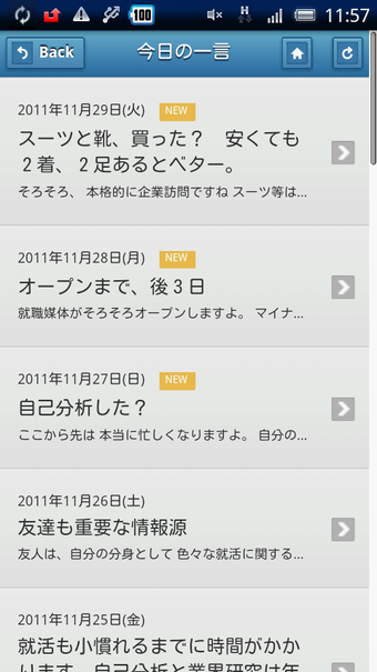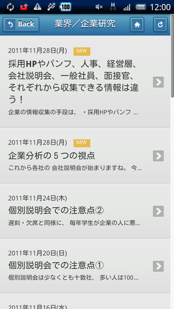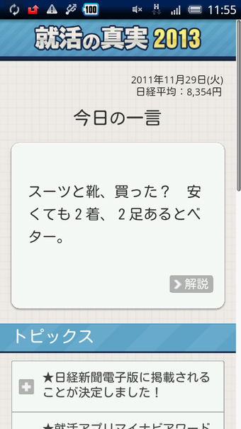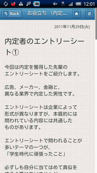 就活の真実2013では、「毎日使える就活ノウハウ(業界/企業研究、自己分析、エントリーシート、選考、お役立ち)」と「今日の一言」の6種類のコンテンツで就職活動をナビゲーションしてくれます。起動すると、「地元で働く?都市部に出る?早めの決断を」のように今日の一言が表示され、タップすると詳しい解説とアドバイスを読めます。バックナンバーも開けるので、今すべき事や既に終わらせているべき事などもチェックできます。各記事には沢山の情報がつまっており、ブログのような親しみやすい文体で読者を鼓舞してくれます。読むだけでも面白いですが具体的な行動の指針にもなるでしょう。